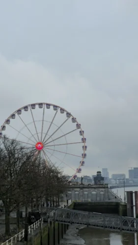 The Antwerp Ferris Wheel is on the bank of the Scheldt River, near the Het Steen castle. This tourist attraction has 36 gondolas you can ride in, and it stands at 50m (165 ft) tall.